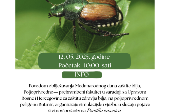 Поводом обиљежавања Међународног дана заштите биља, Пољопривредно-прехрамбени факултет Универзитета у Сарајеву и Управа БиХ за заштиту здравља биља организују симулацијску вјежбу појаве штетног организма Popillia japonica на пољопривредном полигону у Бутмиру.